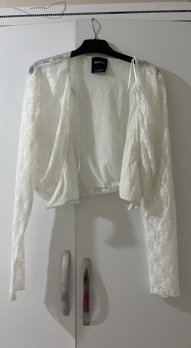 Yumuşak keten kumaştan, uzun dantel kollu, straplez yakalı ve vücuda oturan beyaz bluz. Bohem ve retro tarzlara uygun, düğünler için ideal.