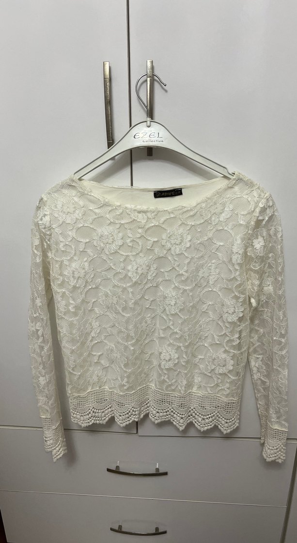 Uzun kollu, yuvarlak yakalı beyaz kadın bluz, dantel işlemeli ve bol kesim, şık davetler için uygundur.