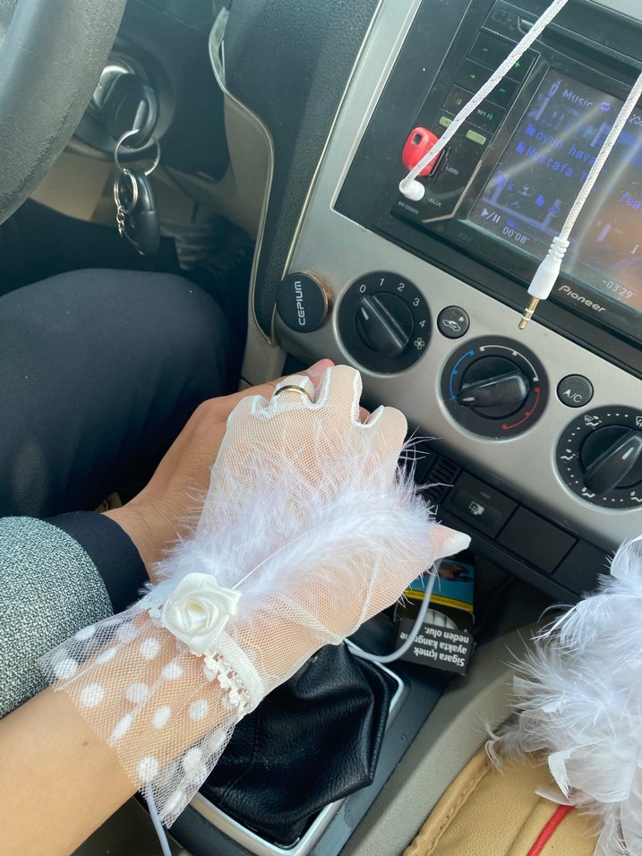 Beyaz örme dantel detaylı, puantiyeli tül ve tüy süslemeli eldiven, vintage bohem tarz için ideal.