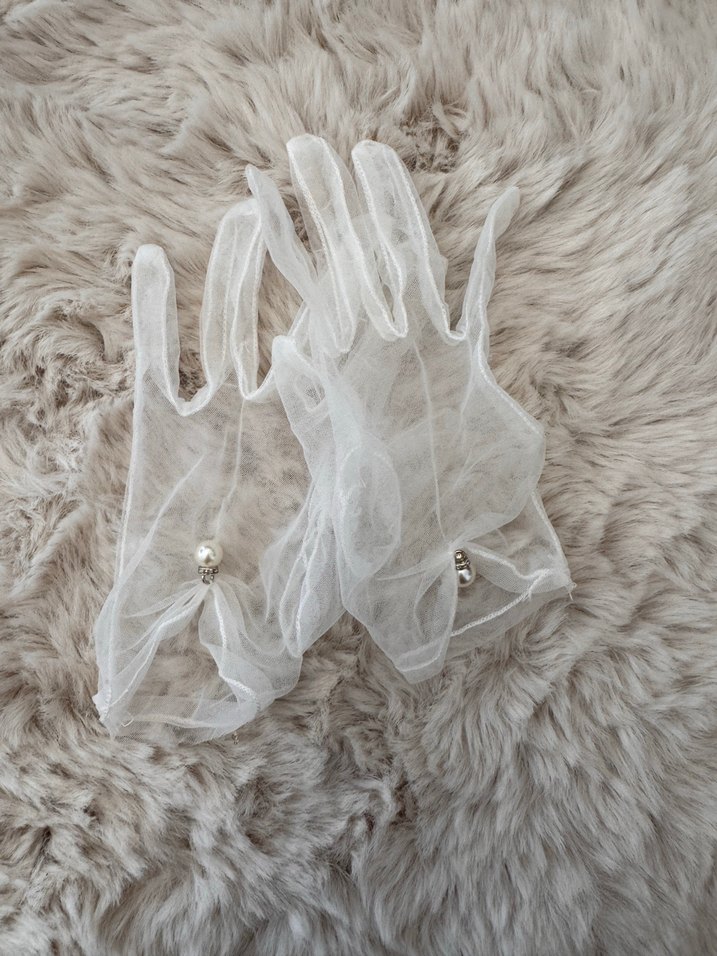 Yumuşak sentetik kumaştan, dantel detaylı ve küçük inci süslemeli beyaz kadın eldiveni, bohem Paris tarzına uygun.