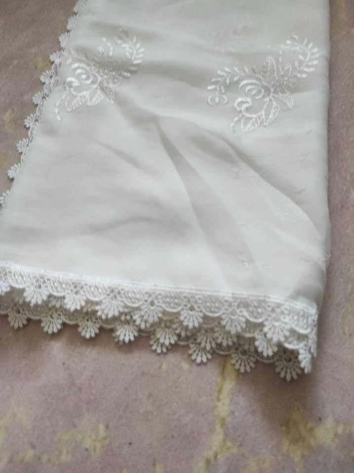 Dantel detaylı, parlak beyaz renkte, yumuşak kumaştan yapılmış, mütevazı ve klasik tarza uygun kadın şalı. tülbent örtü eşarp yeni Urfa yöresine ait eşarp genişlik 102 santim uzunluğu 102 santim görüldüğü gibi