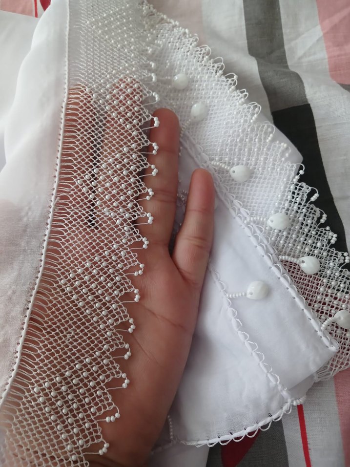 Yumuşak tekstil malzemeden yapılmış, küçük boncuklarla süslenmiş dantel kenarları olan beyaz kadın fular. Bohem ve şık tarz için uygundur. ✨