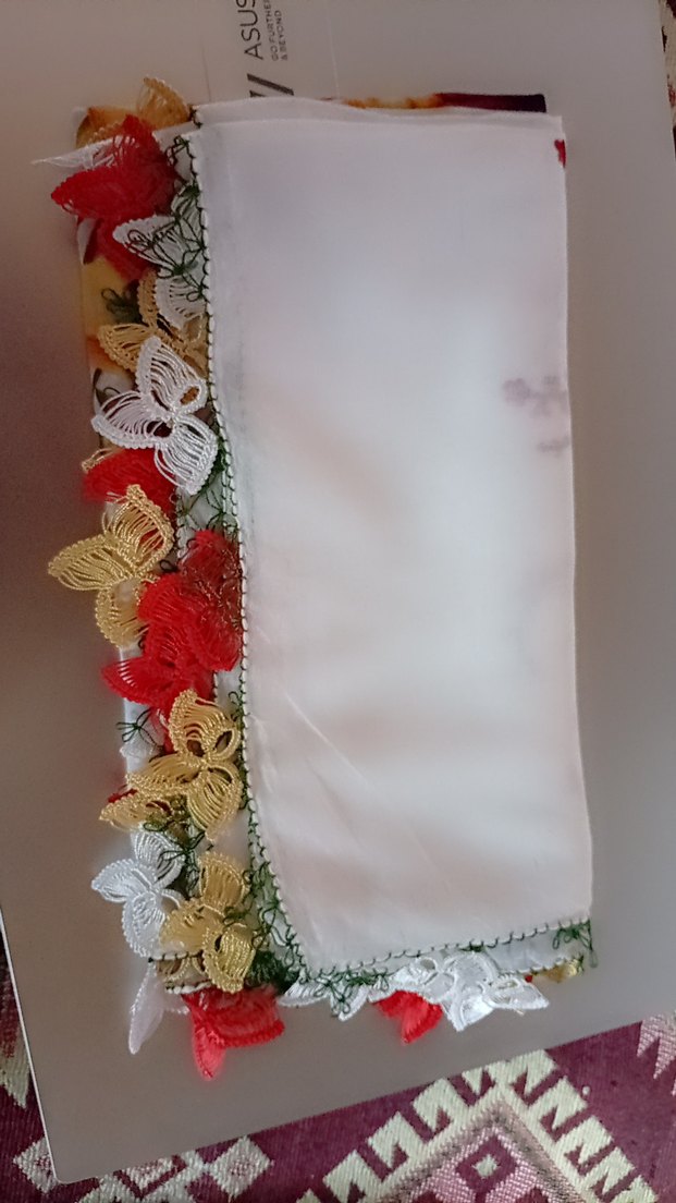 Dantel kenarları ve renkli kelebek desenleriyle beyaz kadın fular, bohem ve retro tarzı yansıtıyor. Yumuşak tekstil malzemeden üretilmiştir.