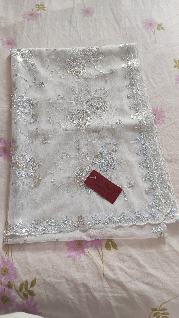 Yumuşak sentetik kumaştan yapılmış, dantel detaylı beyaz kadın fular. Vintage ve bohem tarzında, hafif ve zarif tasarım.