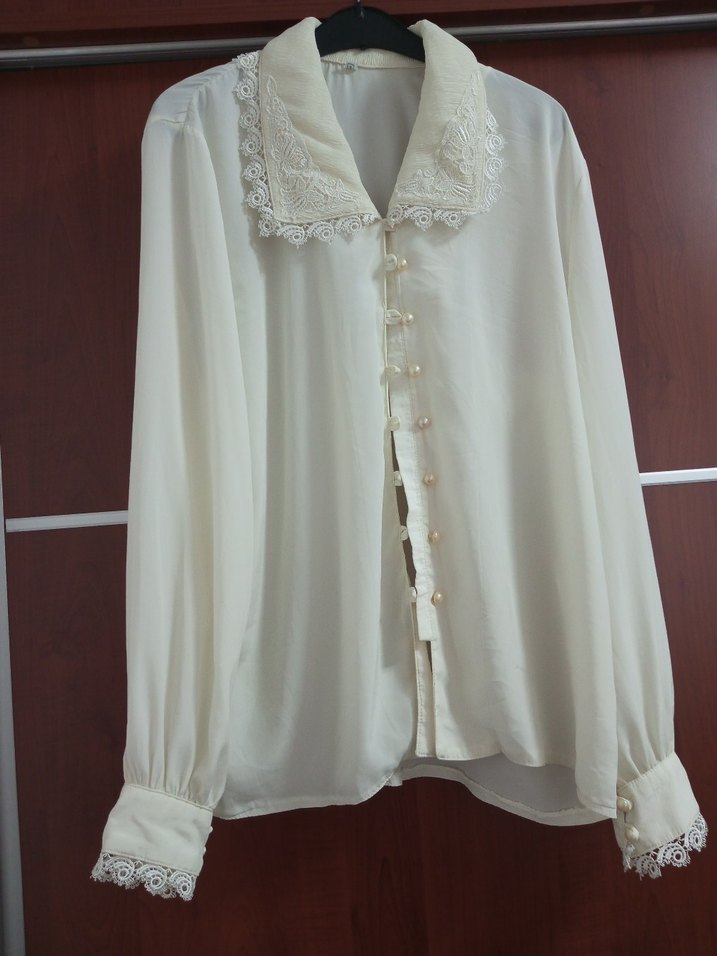 Dantel detaylı yakası ve manşetleri olan beyaz, uzun kollu, düğmeli kadın gömleği. İpek gibi kumaştan, bol kesimli, vintage tarzda, ofis için uygun.