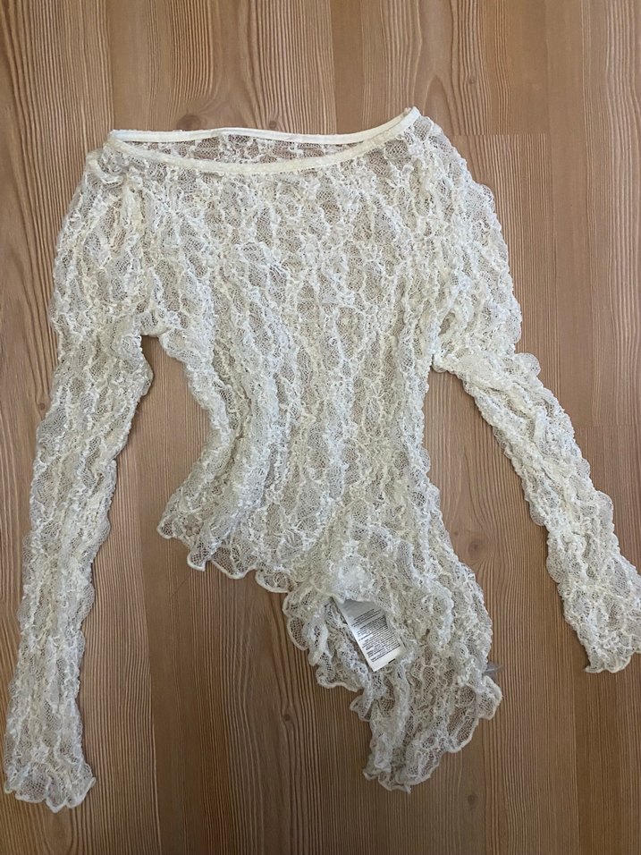 Uzun kollu, dantel detaylı beyaz triko kazak. Salaş kesimi ve kayık yaka tasarımıyla bohem tarzda, günlük kullanıma uygun.