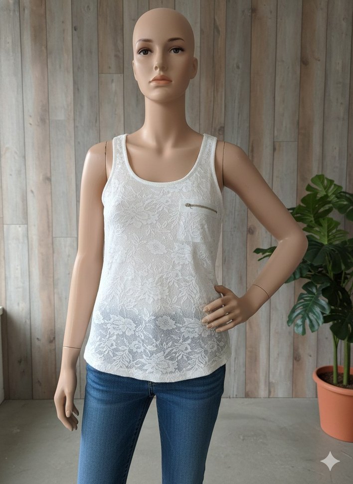 Pamuk kumaştan, dantel detaylı ve desenli beyaz kolsuz kadın bluz. Salaş kesim ve askısız yaka ile günlük kullanıma uygun.