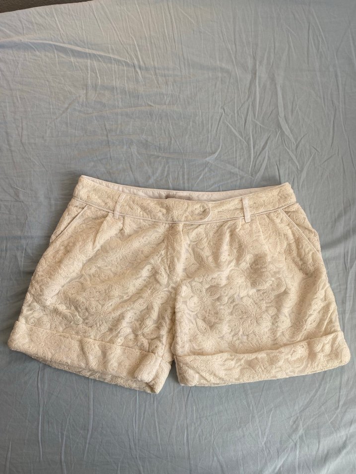 Dantel detaylı, gevşek kesim beyaz mini şort. Yumuşak sentetik kumaştan yapılmış, rahat ve bohem tarzda, açık tonlarda, dış mekan kullanımı için uygun.
