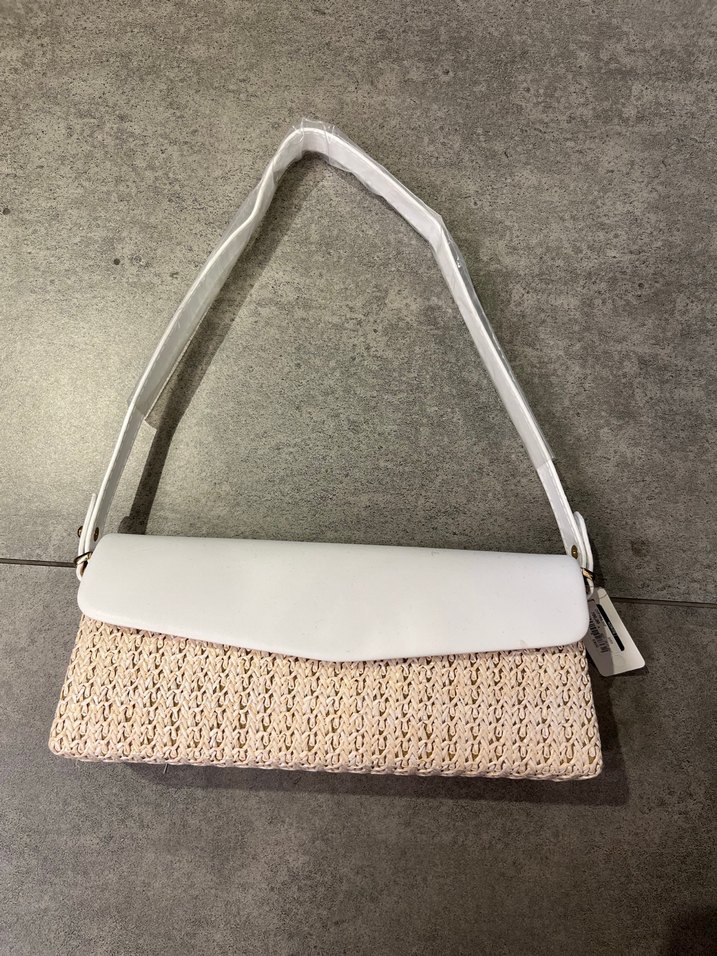 Beyaz sentetik kumaş üst kısmı ve dantel detaylı gövdesiyle minimalist, bohem tarzda kadın omuz çantasıdır.