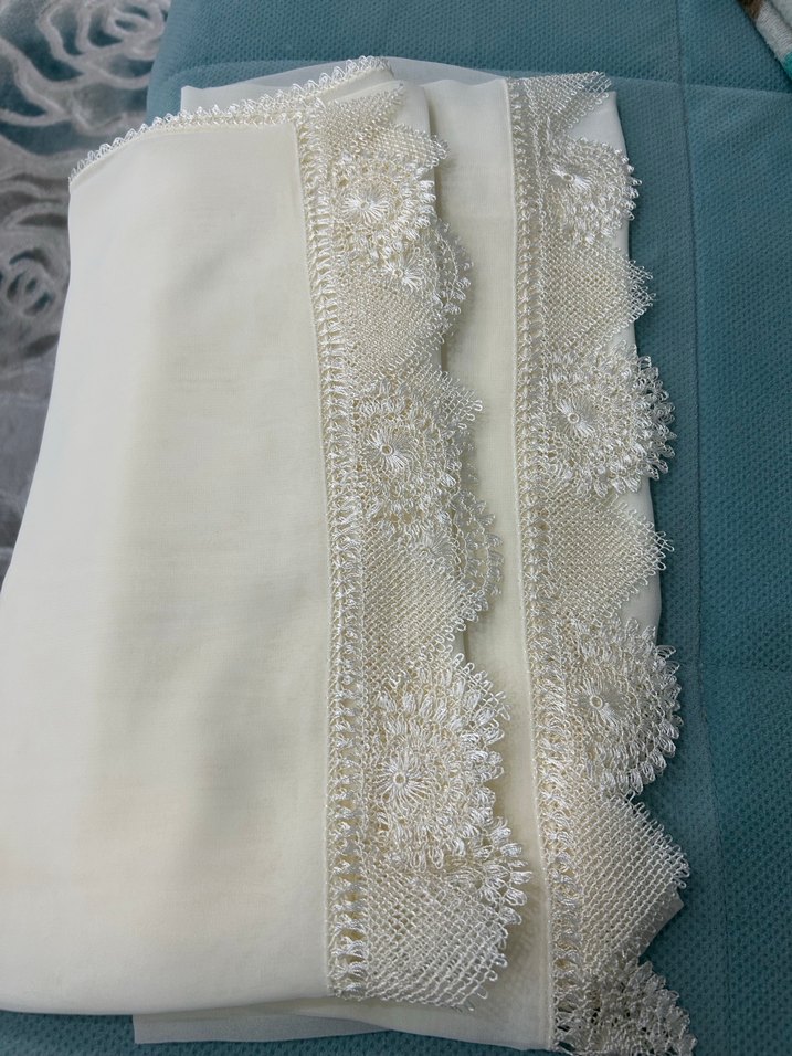 Yumuşak dokulu beyaz kadın şalı, kenarlarında parlak dantel detaylarıyla klasik ve vintage tarzda.