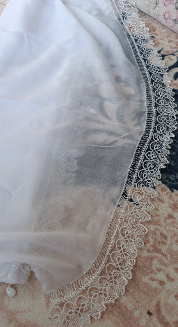 Yumuşak tekstil kumaştan, dantel detaylı beyaz kadın şalı. Klasik zarafet ile hafif bohem tarzı bir arada sunar. el emeği çeyizlik mekik oyasi
