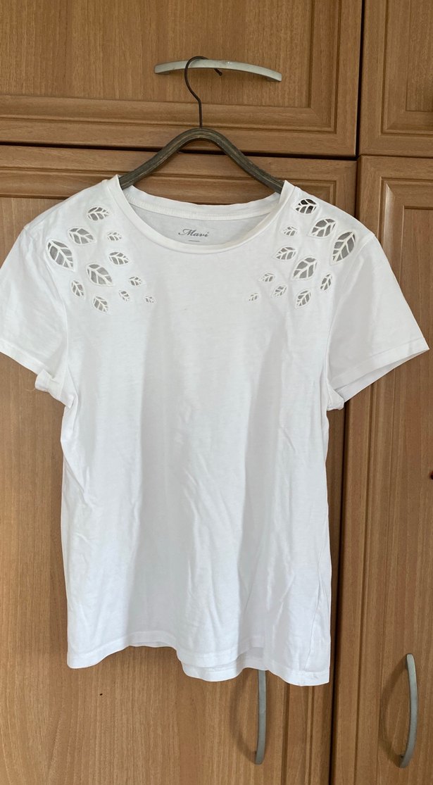 Beyaz pamuklu, kısa kollu, yuvarlak yakalı ve dantel detaylı rahat kesim kadın tişörtü. Günlük kullanıma uygun, rahat bir model.