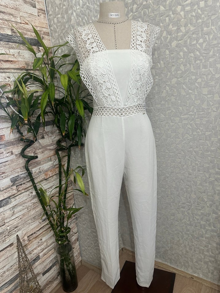 Beyaz uzun tulum, dantel detayları, V yaka ve ince askılarla. Regular fit ve bohem tarzda, düğünler için uygun. Yumuşak sentetik kumaştan üretilmiştir.
