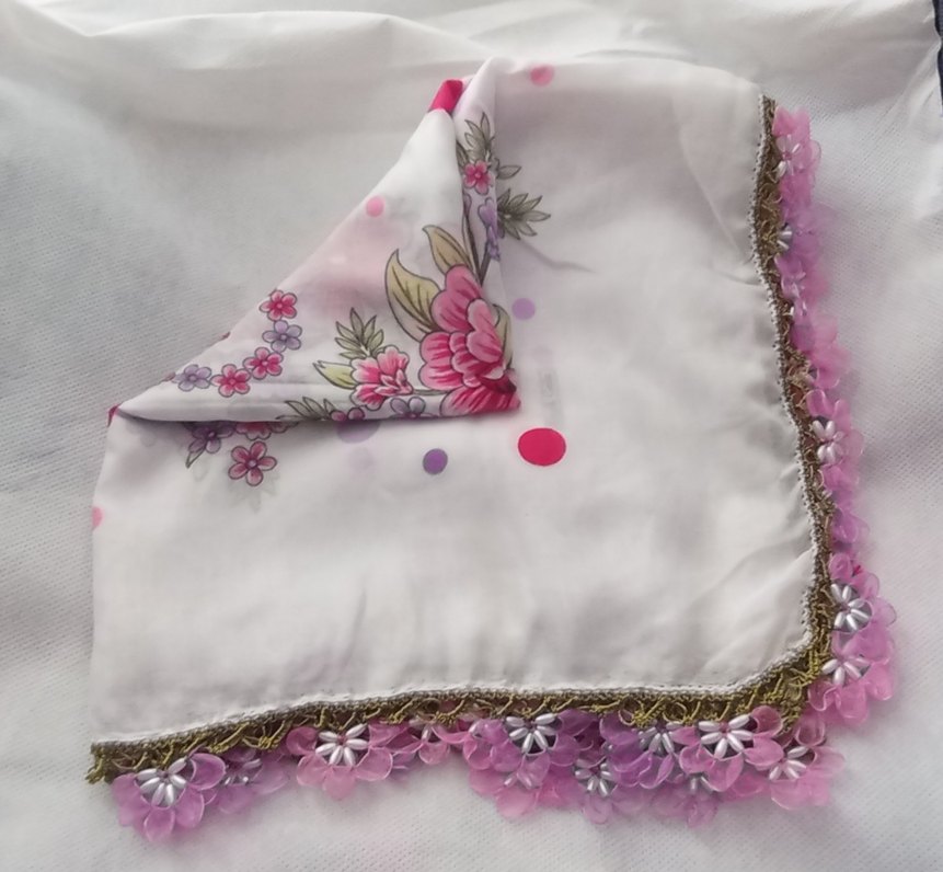 Yumuşak sentetik kumaştan beyaz kadın fular, pastel çiçek desenleri ve ince dantel kenar detayına sahip. Bohem tarz için uygun.