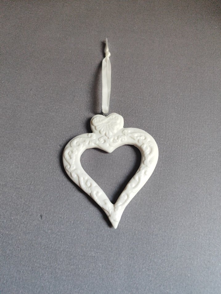 Dantel detaylı beyaz kalp şeklinde nakışlı biblo desenlidir.