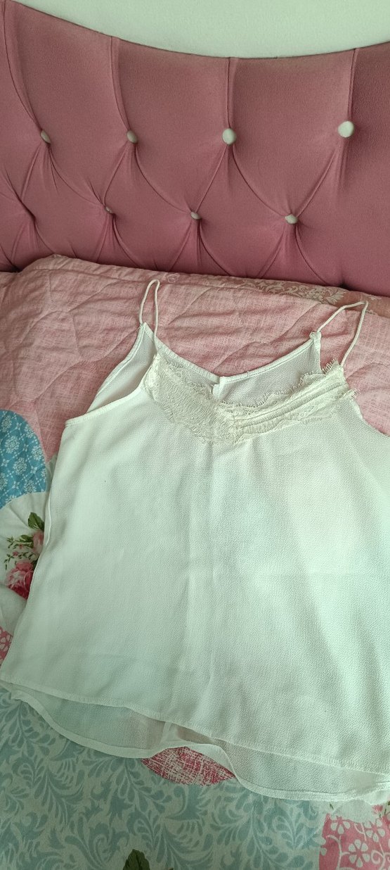 Dantel detaylı, ince askılı beyaz keten bluz, bol kesimli ve vintage bohem tarzda günlük kullanıma uygun.