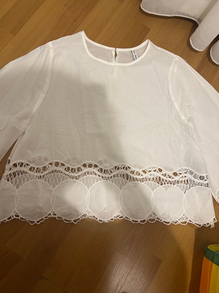 Yuvarlak yaka, uzun kollu beyaz keten bluz, nakışlı desenler ve etek kısmında dantel detayları ile bohem tarzını yansıtır.