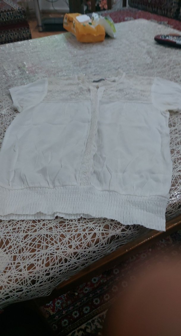 Dantel detaylı, kısa kollu beyaz keten bluz. Bol kesim ve yuvarlak yaka ile bohem tarzına uygun.