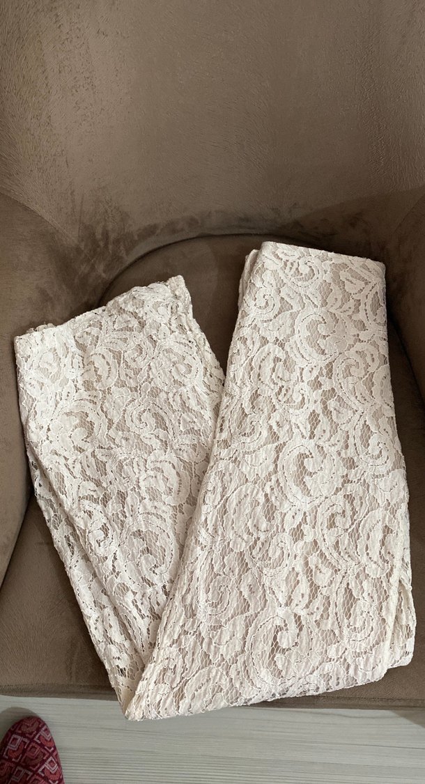 Yumuşak keten kumaş üzerine beyaz dantel detaylı, uzun ve dar kesim bohem tarzda kadın pantolon. Düğünler için uygun, rahat bir his sunar.