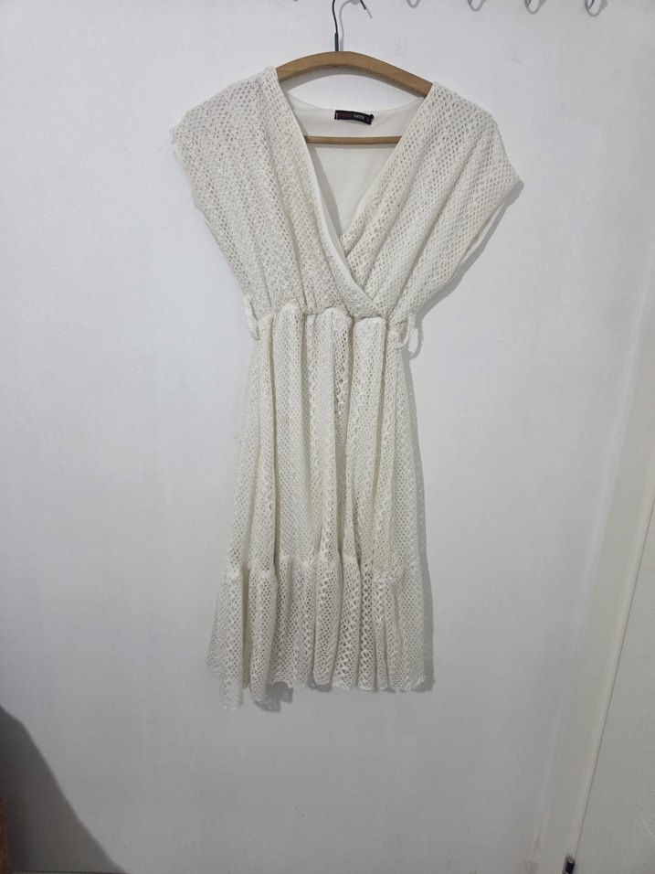 Dantel detaylı, keten kumaştan, beyaz renkli, V yaka ve midi boy, salaş kesim, bohem tarzda kolsuz elbise. Günlük kullanıma uygundur.