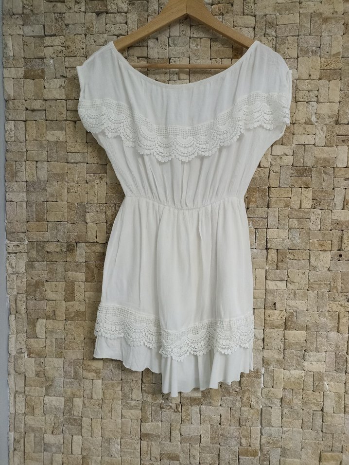 Beyaz keten kumaştan, dantel detaylı ve nakışlı desenli, kayık yakalı, kolsuz, bol kesim mini elbisedir. Bohem tarzı ve düğünler için uygundur. Beden S iki kol arası 53 cm uzunluk 72 cm