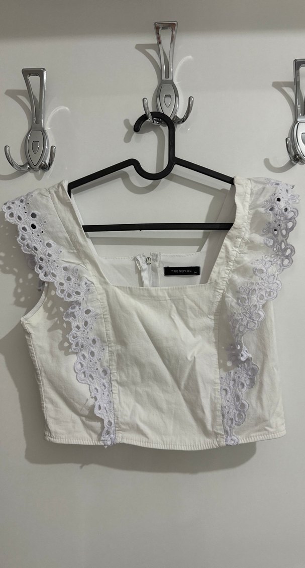 Pamuk kumaştan, dantel işlemeli, beyaz kısa ve fitted kesim, kolsuz kadın bluz. Tekne yaka ve günlük rahat stil için uygundur. birkaç kez kullanıldı. sorunsuz.36 bedene de uyumludur.
