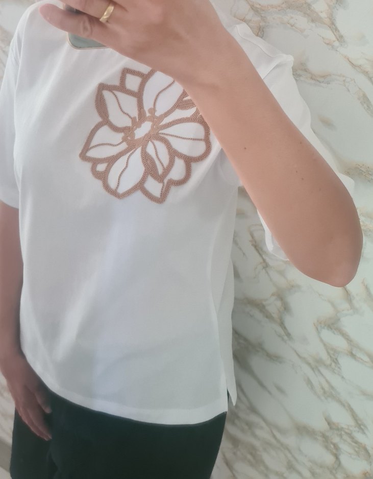 çiçek nakisli, kısa kollu, yuvarlak yaka beyaz tişört. Rahat kesimi ve yumuşak pamuk kumaşı ile günlük kullanıma uygundur.