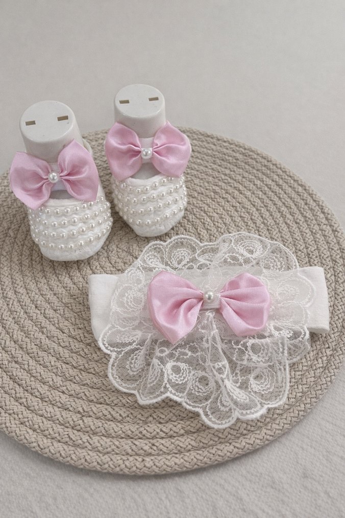 Kız Bebek Patik & Saç Bandı Seti İnci detaylı patikler ve dantel süslemeli saç bandından oluşan şık set. Yumuşak kumaşı sayesinde bebeğin cildine uygundur. Hastane çıkışı, fotoğraf çekimi ve özel günler için idealdir. Set içeriği: 1 çift patik + 1 saç bandı