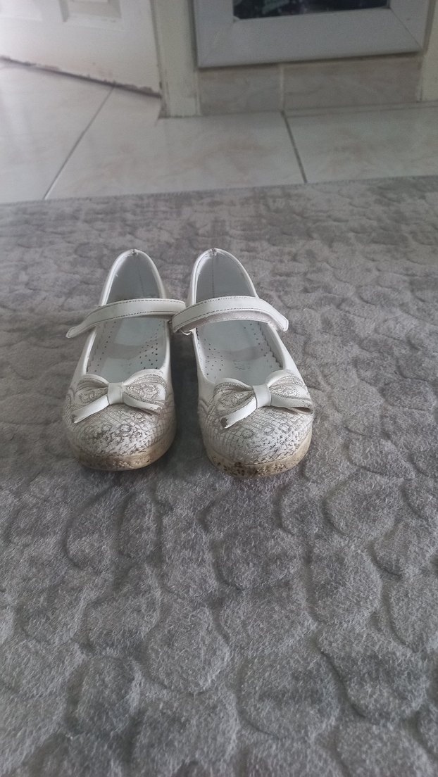 Beyaz renk, dantel fiyonk ve gri yılan derisi desenli, kauçuk malzemeden yapılmış klasik kız çocuk babeti.