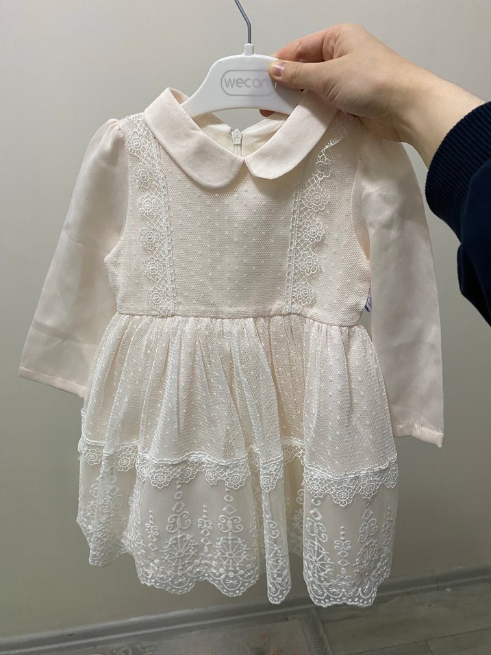 Uzun kollu, yakalı ve dantel işlemeli beyaz kız çocuk elbisesi, ince dokulu sentetik kumaştan yapılmıştır. Fitted kesimi ile modern klasik tarzda.