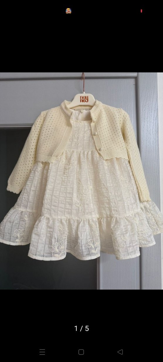 Beyaz, işlemeli dantel detaylı straplez kız çocuk elbisesi, uzun kollu, gevşek kesim örme hırka ile tamamlanmıştır. Pastel tonlarda modern klasik stil sunar. 12-18 ay