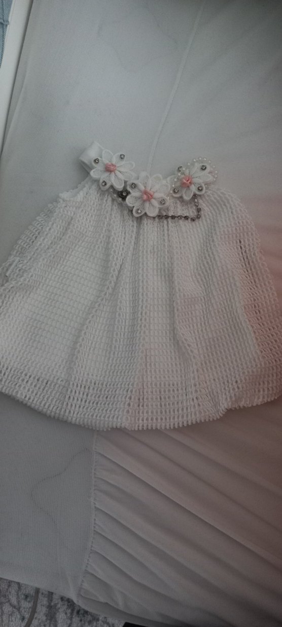 Dantel işlemeli çiçek detaylı, kayık yaka, kolsuz beyaz örme elbise. Bol kesimli, bohem tarzda kız çocuk elbisesi.