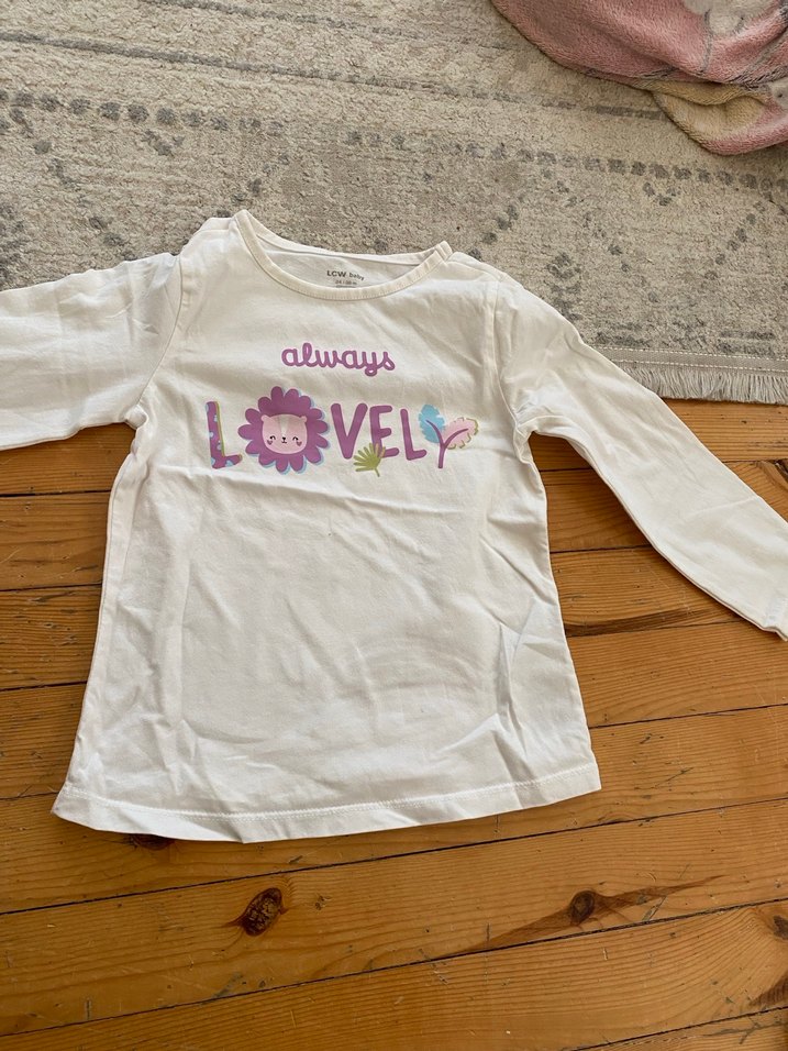 Pamuklu, dantel detaylı, beyaz uzun kollu kız çocuk tişörtü. Bol kesim ve bisiklet yaka, önünde 'always' yazısı ve pastel baskılar bulunur.