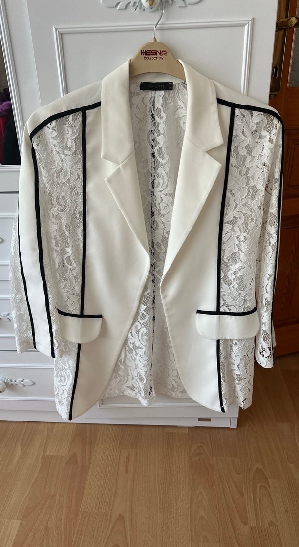 Dantel panelli, siyah işlemeli detaylara sahip beyaz tuxedo ceket. Notch yakalı, askılı kollu ve klasik modern tarzda, ofis için uygun.