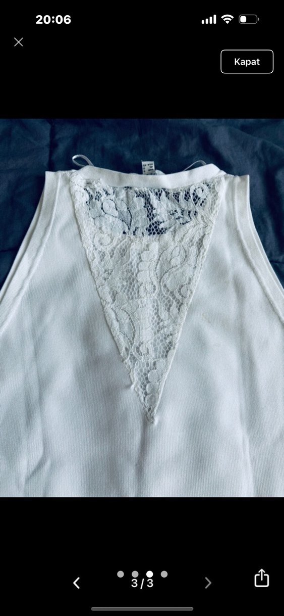 Beyaz kolsuz atlet, sırtında dantel detayına sahip. İnce kesim ve kısa boyda, yumuşak sentetik kumaştan, bohem Yepyeni