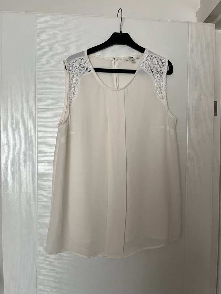 Beyaz kolsuz bluz, omuzlarda dantel detaylı, yuvarlak yaka ve bol kesimdir. Yumuşak sentetik kumaştan üretilmiştir. Ofis için uygundur.