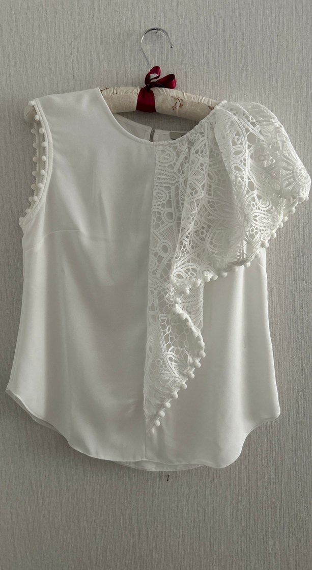 Pamuk kumaştan, nakışlı desenli, tek omuzda dantel detaylı, bol kesim beyaz kolsuz bluz
