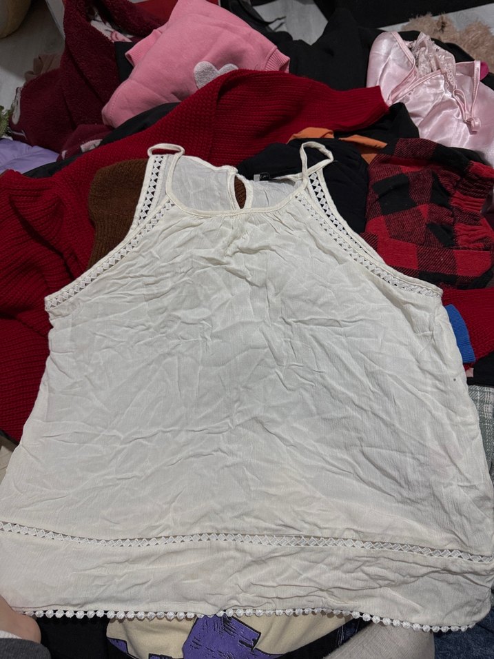 Pamuk kumaştan, yüksek yakalı ve dantel detaylı beyaz kolsuz bluz. Bohem tarzı için uygun, rahat kesimli ve günlük kullanıma uygun.