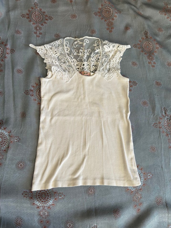 Kolsuz, dantel detaylı beyaz triko bluz, yuvarlak yakalı ve vücuda oturan kesimiyle vintage bohem tarzında bir parça.