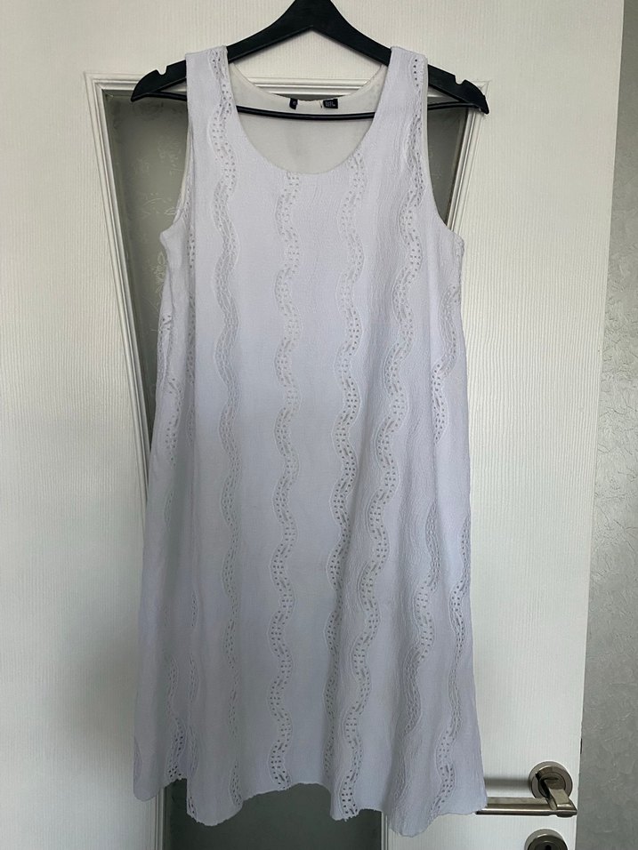 Beyaz keten kumaştan, dantel detaylı ve kayık yaka kesime sahip kolsuz midi elbise. Bol kesimi ve sade tasarımıyla günlük kullanıma uygundur.