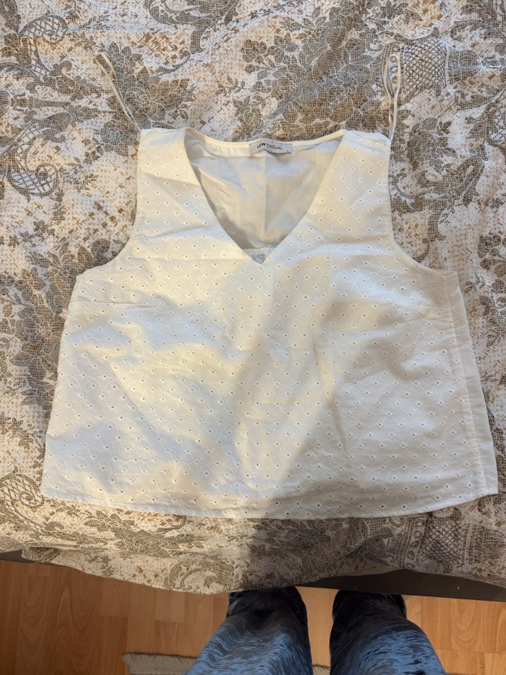 Dantel detaylı beyaz kolsuz kadın bluz, V yaka ve kısa boyda. Yumuşak sentetik kumaştan, bol kesim ve bohem tarzda günlük kullanım için uygun.