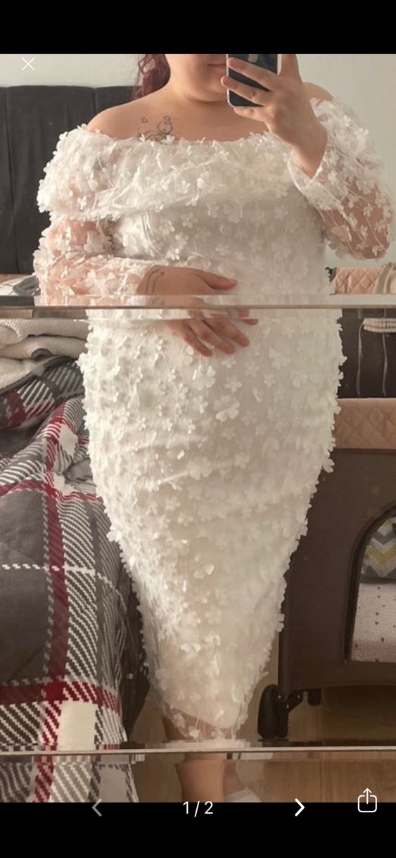 Beyaz midi boy, straplez yaka ve uzun kollu dantel detaylı abiye. Hafif baskılı deseniyle bohem ve şık bir görünüm sunar.
