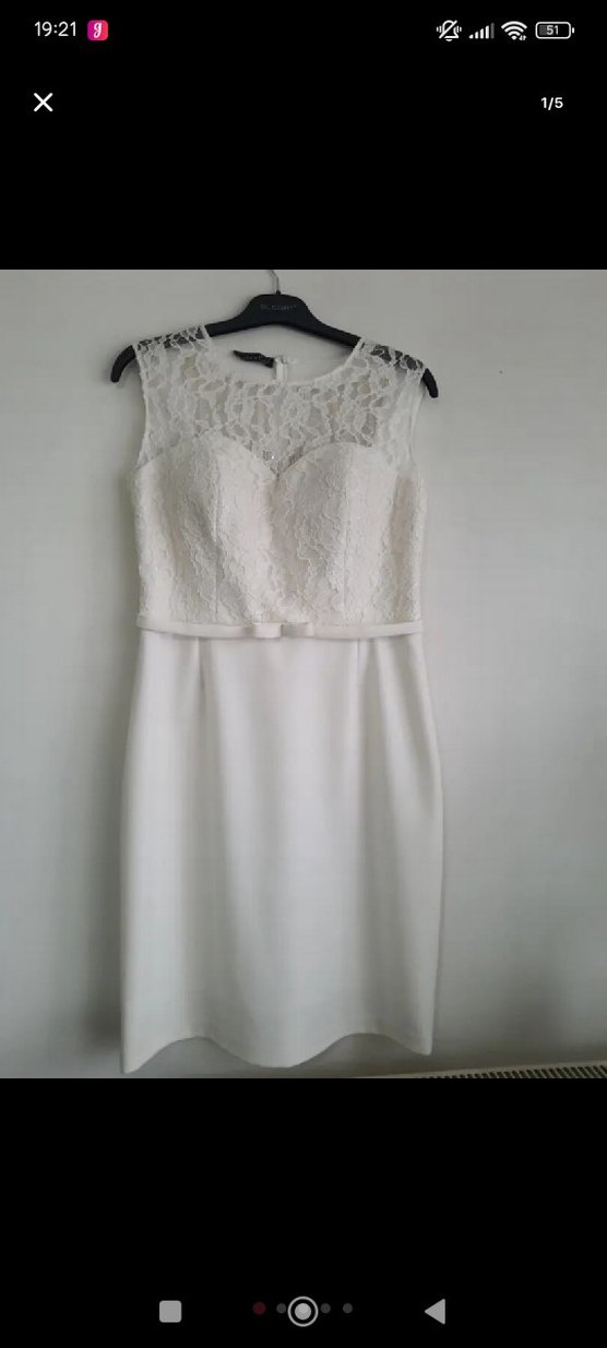 Dantel detaylı, beyaz midi abiye elbise, düğünler için klasik ve modern tarzda, vücuda oturan kesime sahiptir. 42 beden hiç kullanılmamış