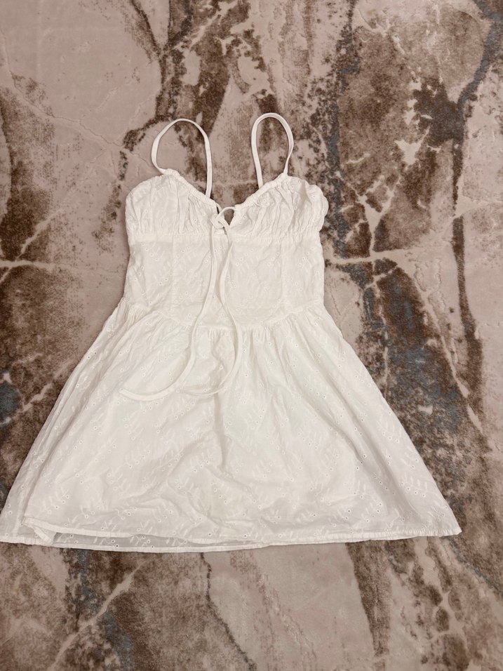 Dantel detaylı, askılı beyaz midi elbise, yumuşak keten kumaştan ve straplez yakalıdır. Rahat bohem tarz için uygundur.