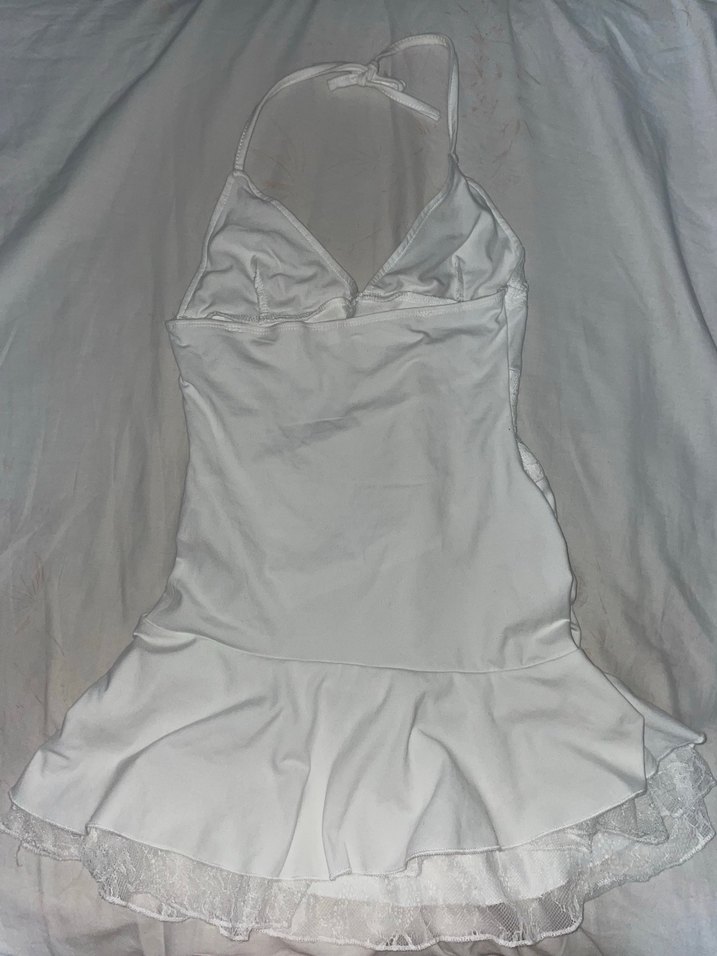 Dantel detaylı, v yaka, kolsuz beyaz midi abiye elbise. Belden oturan kesimi ve sade tasarımıyla parti için uygundur.