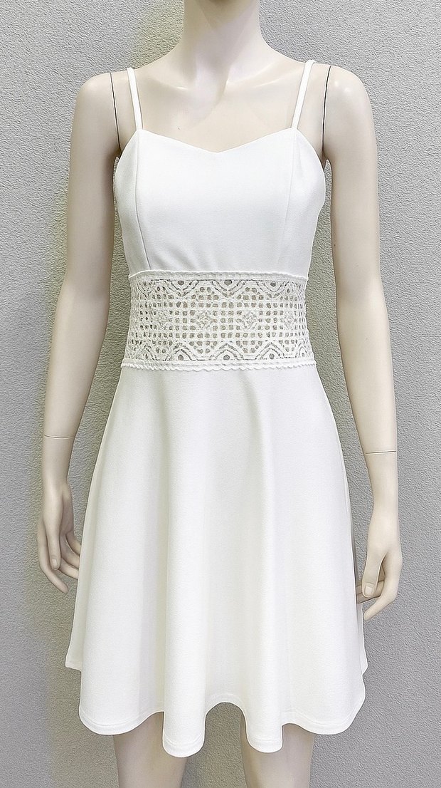 İnce askılı, straplez yaka beyaz midi elbise, belde dantel işlemeli, bohem ve klasik şıklığı bir arada sunar. Düğünler için uygun.