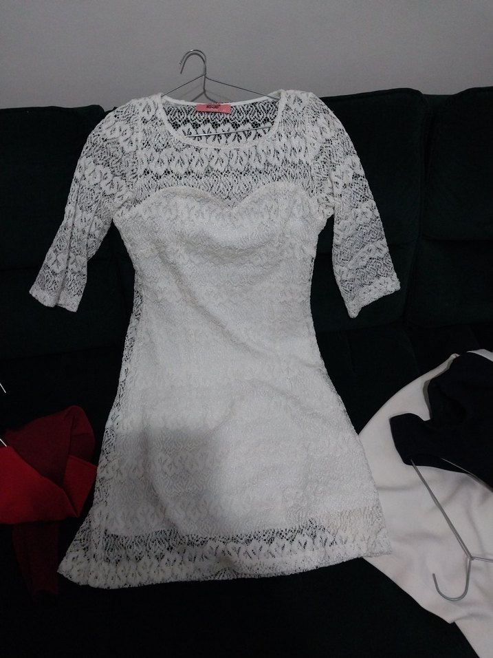Dantel kumaştan, kısa kollu, tek renk beyaz midi boy, vücuda oturan elbise. Minimalist bohem tarzda, günlük kullanım için uygun. içi astarli iç gostermez. M-L arasına uygun olur.171 boyda dizin hemen üstünde kaliyordu.nikah elbisesi olarak kullanılabilir
