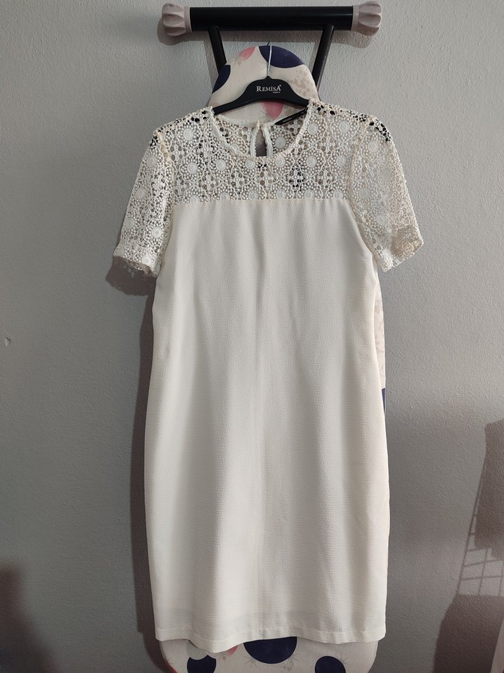 Kısa dantel kollu, yuvarlak yakalı beyaz midi elbise, modern klasik tarzda, ofis için uygun, rahat kesim.