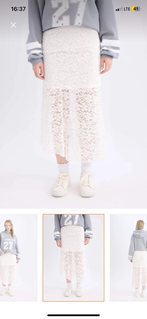 Beyaz midi uzunlukta dantel detaylı, gevşek kesimli ve triko kumaştan yapılmış etek. Minimalist ve normcore tarzda, günlük kullanıma uygun.
