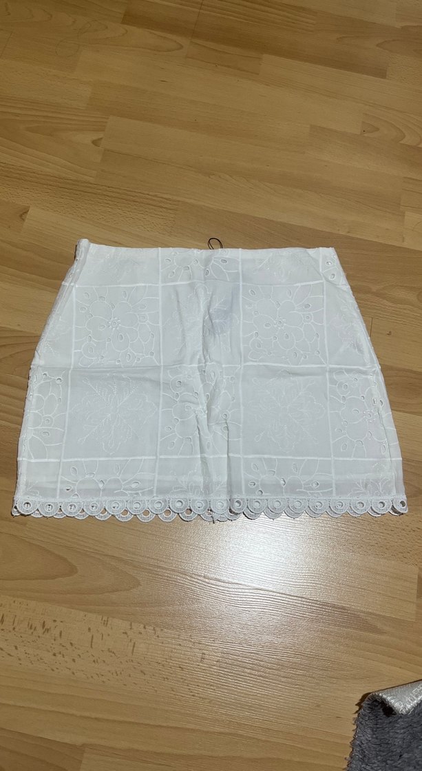 Bu bol kesim beyaz midi etek, nakışlı dantel detaylara sahip ve yumuşak kumaştan üretilmiştir. Günlük kullanıma uygun bohem tarzı yansıtır. Hiç giyilmedi Tuba ünsal koleksiyon ürünüdür